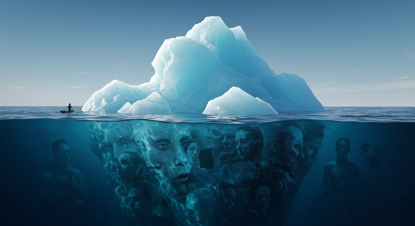 Formado de gelo, em plena água do mar, uma parte dele é visível e outra, maior ainda, não. A figura do iceberg é bastante usada como metáfora em aulas introdutórias de psicanálise para tratar do inconsciente. É recorrente, é! Mas ajuda a associar as ideias. O que está acima da superfície representa o consciente e o que está abaixo (submerso), o inconsciente. Espero que o Titanic desvie dessa vez.